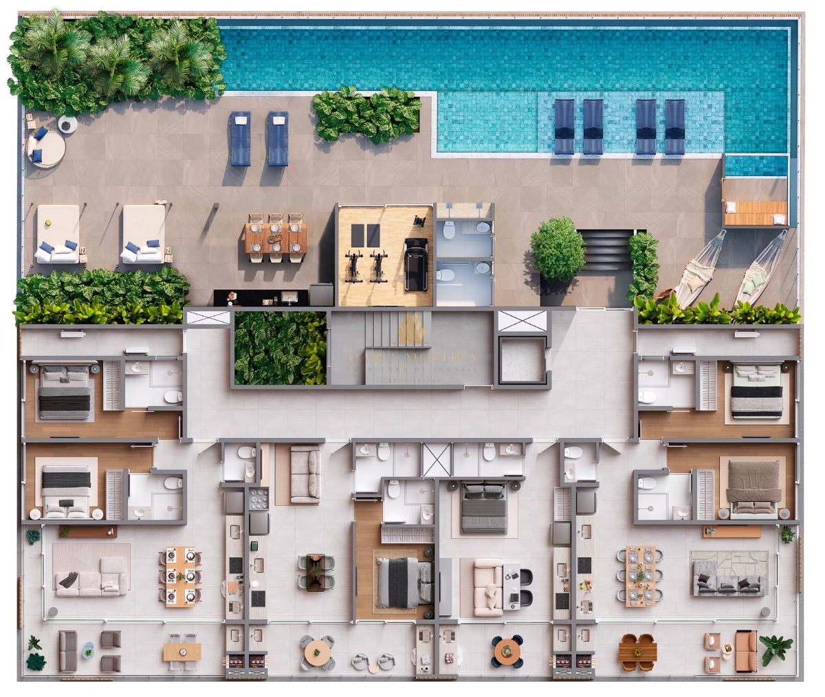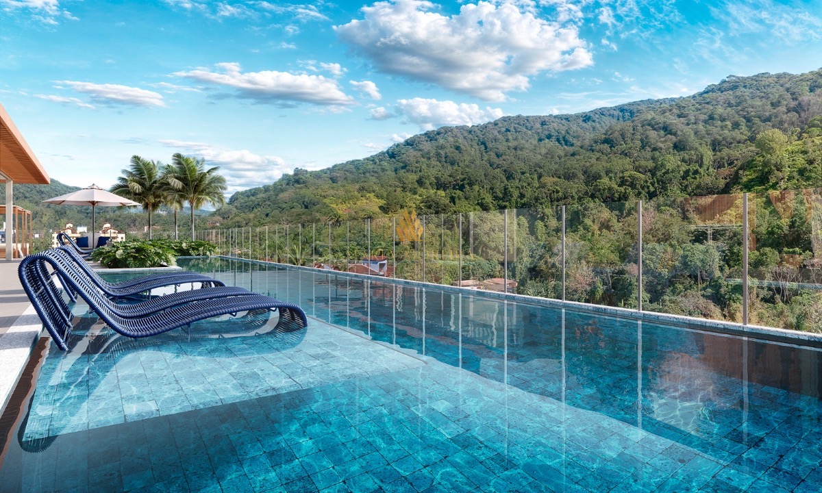 Lazer panorâmico na cobertura com piscina adulto com raia, piscina infantil, deck, solarium, sauna integrada c/ pisicna,